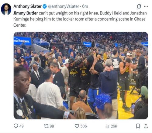 勇士記者安東尼-斯萊德發(fā)來(lái)最新消息,巴特勒的右膝無(wú)法負(fù)重,他進(jìn)入更衣室是在希爾德、庫(kù)明加的攙扶下。