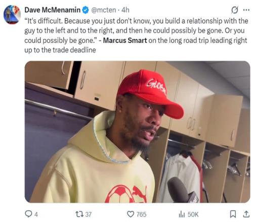 賽后斯瑪特也談到了即將到來的交易截止日,他說道:這很難,因?yàn)閯倎砬蜿?duì)沒多久才跟某些隊(duì)友建立了聯(lián)系他們可能就要離開了,當(dāng)然也有可能是我離開。