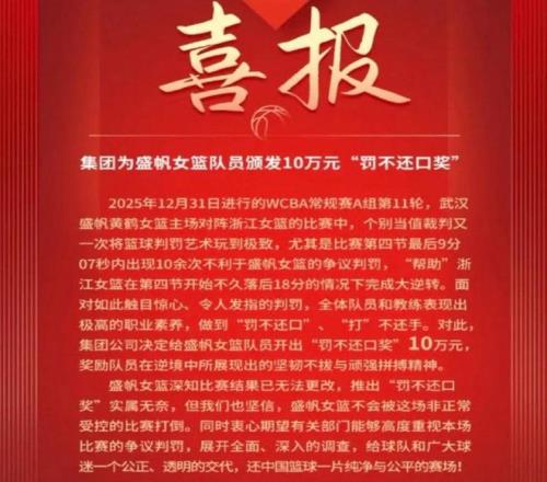2025年12月31日WCBA第11輪,武漢盛帆女籃遭遇爭議判罰,導(dǎo)致輸給浙江女籃。賽后,武漢盛帆女籃因球員和教練在爭議判罰中保持"罰不還口""打不還手"的職業(yè)素養(yǎng),特獎勵全隊10萬元。此舉旨在肯定球員精神,同時表達對裁判工作的強烈不滿。